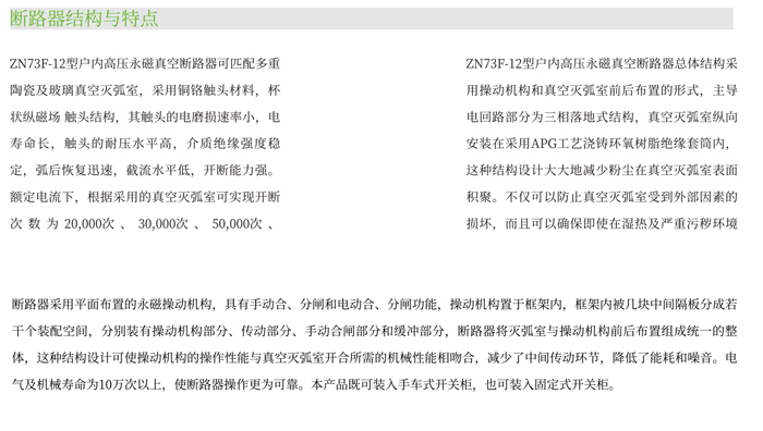 ZN73F-12型永磁機(jī)構(gòu)戶內(nèi)高壓真空斷路器是我公司通過(guò)總結(jié)多年來(lái)積累的豐富的現(xiàn)場(chǎng)經(jīng)驗(yàn),本著安全可靠、長(zhǎng)壽命、少維護(hù)的設(shè)計(jì)理念,憑借雄厚的技術(shù)實(shí)力自主研發(fā)的新一代高壓真空斷路器。